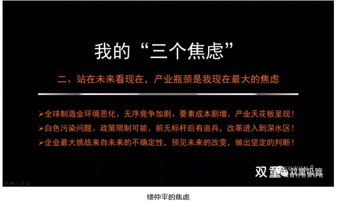 在聽(tīng)到馬云的金句后,樓仲平表示他終于知道原來(lái)馬云也在焦慮。他分享道:我也有自己的焦慮,我深刻理會(huì)到這種焦慮在現(xiàn)在時(shí)代下是油然而生的,這也是這個(gè)時(shí)代的焦慮。這種焦慮來(lái)源于你能看清這個(gè)時(shí)代,感受到這個(gè)時(shí)代的高速變化,感受到制造業(yè)和整體經(jīng)濟(jì)的變化。”