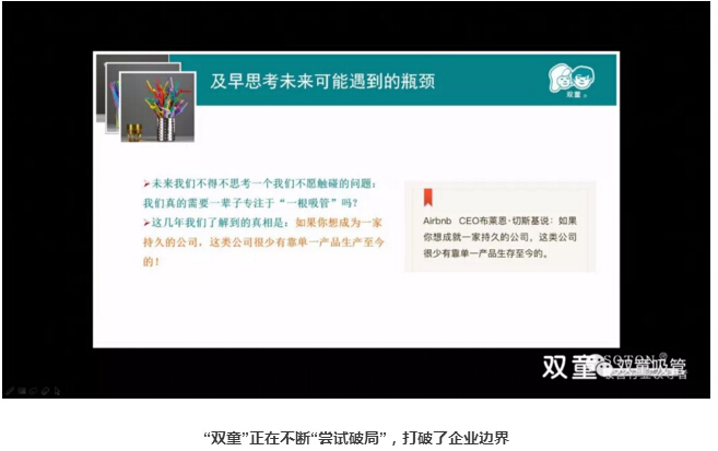 基于這樣的思考,“雙童”正在不斷“嘗試破局”。2016年9月,“雙童”發(fā)布了第四個(gè)《五年發(fā)展規(guī)劃》,但僅僅半年時(shí)間,我們對(duì)未來(lái)戰(zhàn)略進(jìn)行調(diào)整,對(duì)《五年發(fā)展規(guī)劃》進(jìn)行重新修訂,乃至于將《經(jīng)營(yíng)哲學(xué)》中“五十年專注一根吸管”的理念刪除,去買土地建廠房為年輕人創(chuàng)造一個(gè)新的創(chuàng)業(yè)平臺(tái),以打破企業(yè)的邊界!