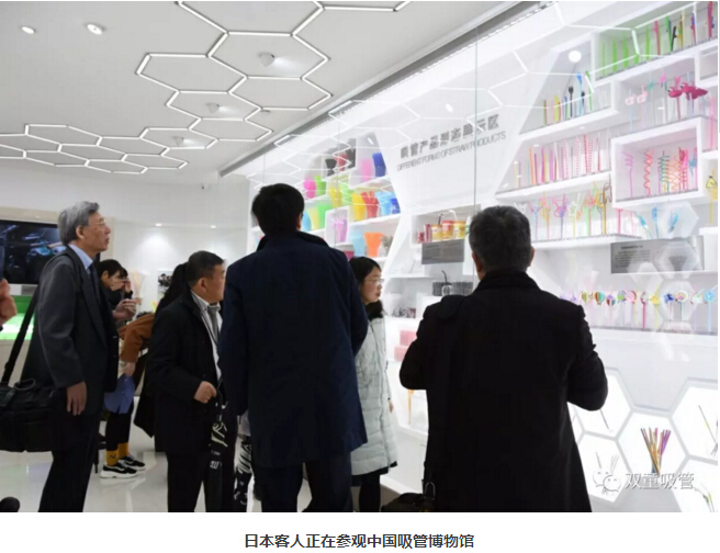 接著,大家一起參觀了產品發(fā)展歷史展示區(qū)、吸管生產技術展示區(qū)、吸管產品形態(tài)展示區(qū)等各類吸管的展示區(qū)域。在參觀過程中,坂本光司老師在了解到“雙童”在2005年就開發(fā)研制出PLA生物質可降解吸管,對“雙童”超前的環(huán)保理念十分認可!博物館中琳瑯滿目、形態(tài)各異的吸管產品讓日本參觀團隊的驚嘆聲此起彼伏,紛紛對“雙童”的創(chuàng)新研發(fā)能力豎起了大拇指!