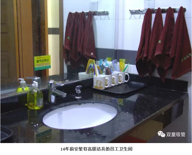 “雙童”很奢,奢在連員工寢室的“水龍頭”都要四五百塊錢(qián)一個(gè)!2004年,“雙童”按三星級(jí)標(biāo)準(zhǔn)裝修了所有員工寢室。每個(gè)寢室都配有干凈整潔的洗手間、寬敞明亮的洗衣陽(yáng)臺(tái)和格力的空調(diào),并配有各種家具,還提供24小時(shí)的熱水和純凈水飲用系統(tǒng)。連衛(wèi)生間內(nèi)配置的科勒牌水龍頭價(jià)格就高達(dá)500多元,十多年過(guò)去至今沒(méi)有壞過(guò)一個(gè)。