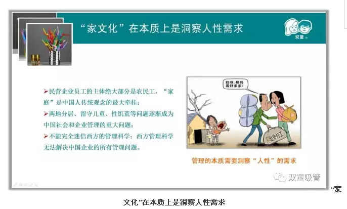 在西方管理當(dāng)中,與企業(yè)無(wú)關(guān)的人員一般不得出現(xiàn)在企業(yè)內(nèi)部。但在中國(guó)卻未必可行,“家庭”是中國(guó)人傳統(tǒng)觀念的最大牽掛,一個(gè)正常理性的人在面對(duì)家庭和工作兩難選擇時(shí)必然會(huì)放棄工作作為最優(yōu)選擇。當(dāng)組織無(wú)法和員工一起來(lái)平衡工作與家庭的關(guān)系,必然會(huì)給員工和組織帶來(lái)傷害。所以,我們不能完全迷信西方管理科學(xué),而應(yīng)思考如何用中國(guó)人的方式來(lái)解決部分管理問(wèn)題。