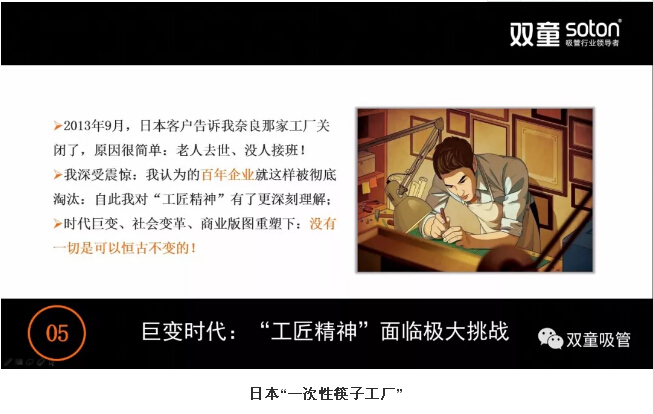首先,“雙童”樓仲平分享了日本奈良“一次性筷子工廠”的故事及日本企業(yè)存在的“致命”問(wèn)題。如今,日本推崇極致“工匠精神”的企業(yè)被逐漸淘汰。另外,極致的“工匠精神”也讓日本年輕人不愿意接班,經(jīng)營(yíng)層老齡化成為日本中小企業(yè)的突出特征!