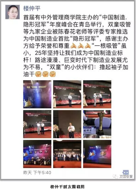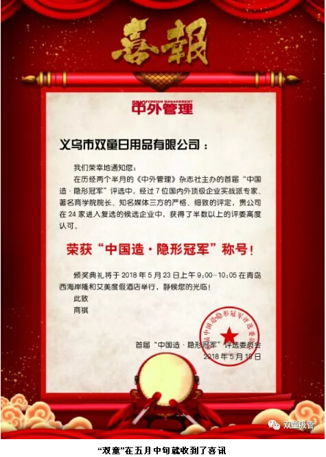 據(jù)悉,此次“中國(guó)造·隱形冠軍”評(píng)選有全國(guó)各地24家企業(yè)入圍,經(jīng)過(guò)北京大學(xué)國(guó)發(fā)院BiMBA商學(xué)院院長(zhǎng)陳春花教授等七位評(píng)委專(zhuān)家的評(píng)選,共有9家企業(yè)脫穎而出,被推選為首批“中國(guó)造·隱形冠軍”。首批實(shí)至名歸的“中國(guó)造·隱形冠軍”企業(yè)代表上臺(tái)領(lǐng)獎(jiǎng),接受官產(chǎn)學(xué)媒各界的掌聲!“雙童”也名列其中!
