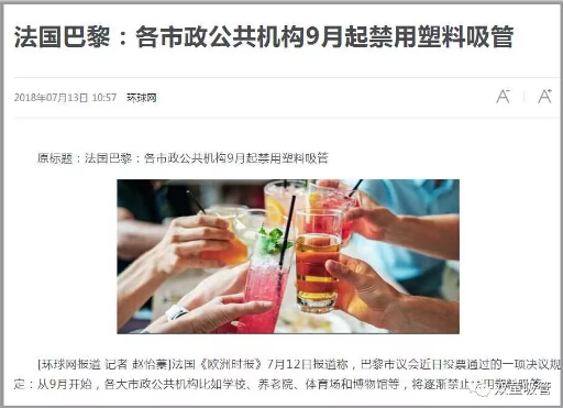 法國《歐洲時報》報道稱,巴黎市議會投票通過的一項決議規(guī)定:從9月開始,各大市政公共機構(gòu)比如學校、養(yǎng)老院、體育場和博物館等,將逐漸禁止使用塑料吸管。