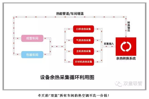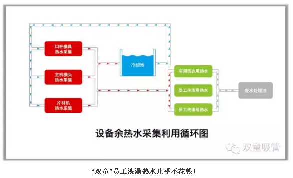 “雙童”對(duì)所有經(jīng)過模具的50度溫水進(jìn)行收集,處理之后供應(yīng)到所有寢室衛(wèi)生間給員工洗澡洗衣生活之用。同時(shí),“雙童”對(duì)所有生產(chǎn)設(shè)備的余熱和廢氣進(jìn)行采集并回收,再通過空調(diào)管道輸送到需要加溫的各個(gè)車間和工段。通過上述方式,“雙童”光是在余熱水采集和設(shè)備余熱采集方面,每年就節(jié)省了150多萬元,消滅了企業(yè)產(chǎn)生的污染和排放!