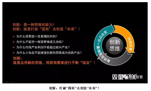 現(xiàn)在,不少人動(dòng)不動(dòng)就喊要?jiǎng)?chuàng)新,但是到底什么是創(chuàng)新?我一直理解創(chuàng)新工作的本質(zhì)在于“思維創(chuàng)新”,就是運(yùn)用新的思維,將原有要素進(jìn)行不斷“組合”,打破“固有”創(chuàng)造“未有”。只有用創(chuàng)新思維去做產(chǎn)品、做事業(yè),才能改變自己乃至于整個(gè)企業(yè)的命運(yùn)!