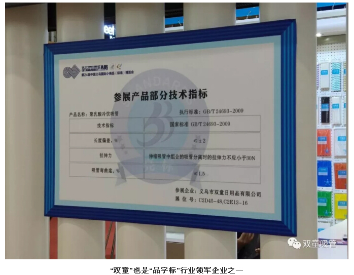 義博會現(xiàn)場,20余家“品字標”行業(yè)領(lǐng)軍企業(yè)集中亮相,“雙童”也是其中之一?!半p童”展區(qū)不僅展示了琳瑯滿目的吸管產(chǎn)品,而且在最耀眼的位置擺放了組委會頒發(fā)的亮標牌及產(chǎn)品技術(shù)指標牌,讓來往的客商們第一時間了解到“雙童”產(chǎn)品參數(shù)及品質(zhì)。