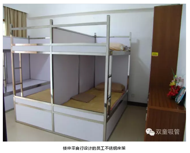 “雙童”員工集體寢室的不銹鋼床架可是參觀團(tuán)隊(duì)最津津樂道的話題之一!這些床架都是由“雙童”樓仲平自行設(shè)計(jì),在建造之初就把床架焊在地上。這樣一來,即避免產(chǎn)生垃圾死角,床下又多了一個(gè)封閉的儲物空間,確保員工在生活方面的便利舒適!
