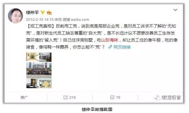 其實(shí),“雙童”樓仲平由于早年坎坷辛苦的創(chuàng)業(yè)經(jīng)歷,一直對農(nóng)民工感同身受,十分注重員工的吃住問題。早在2012年,樓仲平就發(fā)布了一條關(guān)于員工住宿的微博,引起了極大的關(guān)注。微博上寫道:自己住洋房別墅,卻讓員工住的像牛棚狗窩,你怎么能留得住員工?員工是企業(yè)的基礎(chǔ),對員工更好、企業(yè)反而會獲得更多!
