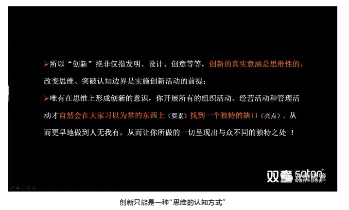 由此我們得出一個(gè)結(jié)論:“創(chuàng)新”絕非僅指發(fā)明、設(shè)計(jì)、創(chuàng)意等,創(chuàng)新是一種“思維的認(rèn)知方式”,在大家都習(xí)以為常的東西上,找到一個(gè)獨(dú)特的缺口,從而更早地做到“人無(wú)我有”。