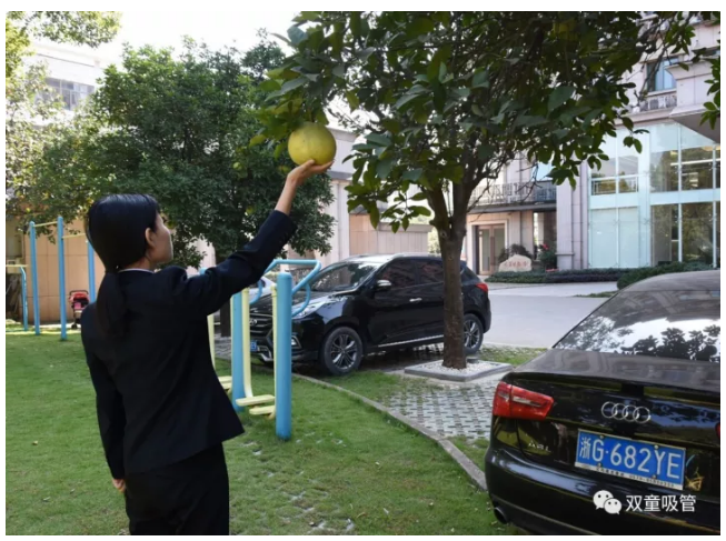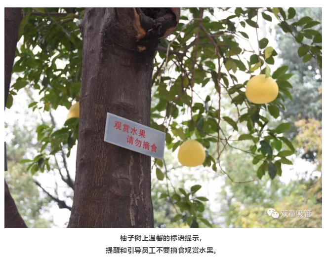 原來(lái),為了“雙童”的生態(tài)和美觀,公司明確柚子是觀賞性水果,每棵柚子樹(shù)上都有“觀賞水果,請(qǐng)勿摘食”的字樣,提醒和引導(dǎo)員工不要摘食觀賞水果。