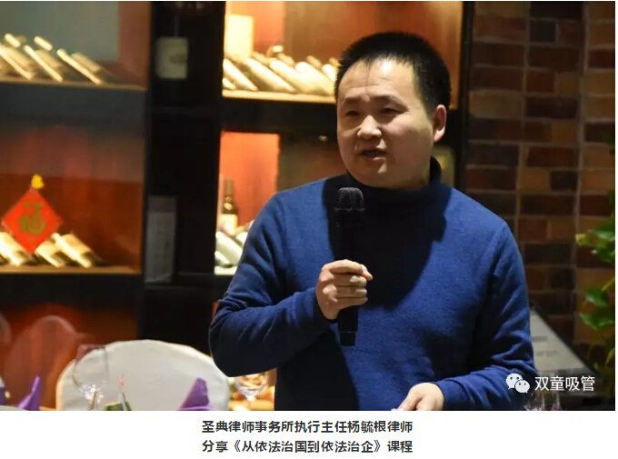 年會中的下一項(xiàng)議程,是由圣典律師事務(wù)所執(zhí)行主任楊毓根律師分享《從依法治國到依法治企》,楊毓根律師首先也和大家分享了從法律角度對“慎”字的理解,并結(jié)合事例向大家分享了為何要推動依法治國和依法治企,以及依法治企的重要性!