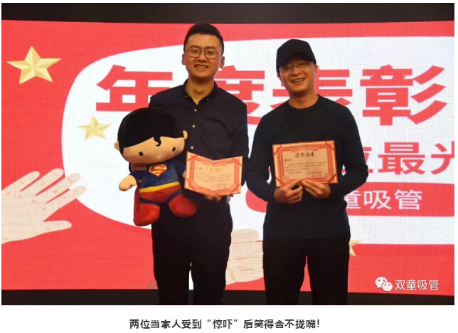 在“雙童”年會(huì)現(xiàn)場(chǎng),吸管妞給“雙童”當(dāng)家人樓仲平和二當(dāng)家李二橋頒發(fā)了史上最大膽的獎(jiǎng)項(xiàng)?。ㄊ孪葲]有透露哦)