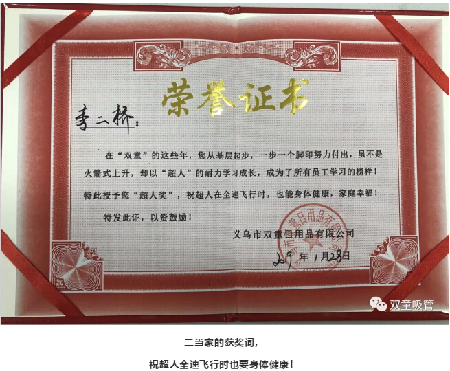 榮譽(yù)證書:李二橋,在“雙童”的這些年,您從基層起步,一步一個(gè)腳印努力付出,雖不是火箭式上升,卻以“超人”的耐力學(xué)習(xí)成長(zhǎng),成為了所有員工學(xué)習(xí)的榜樣!特此授予您“超人獎(jiǎng)”,祝超人在全速飛行時(shí),也能身體健康,家庭幸福!