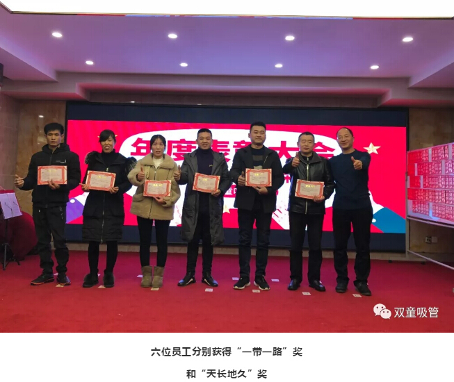 另外,我們還分別給六位員工頒發(fā)了特別的獎(jiǎng)項(xiàng):“一帶一路”獎(jiǎng)和“天長(zhǎng)地久”獎(jiǎng)。
