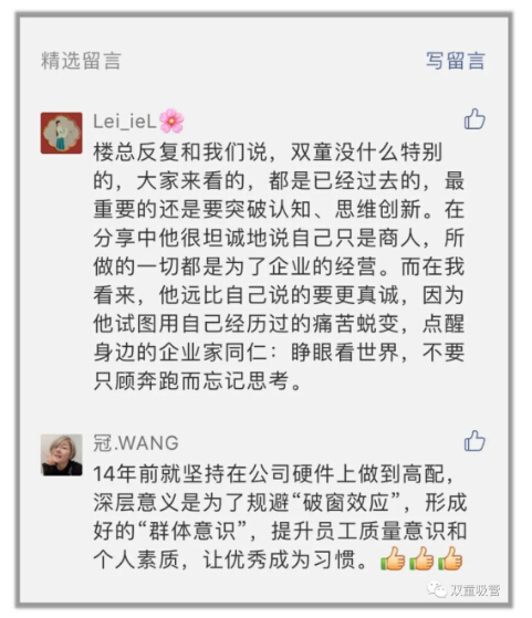 我和樓總其實之前就認識,2017年我?guī)е懈邔觼磉^,但是今天來,感覺變化很大、企業(yè)文化建設很完善。您剛才提到2016、2017年企業(yè)的陣痛我之前沒想到,我們公司也是近兩年進入快速發(fā)展期,人才跟不上。原來想踩剎車、慢一點,現(xiàn)在我更堅定要跑快一點。今年,我決定我們整個公司就定下來要學習“雙童”。