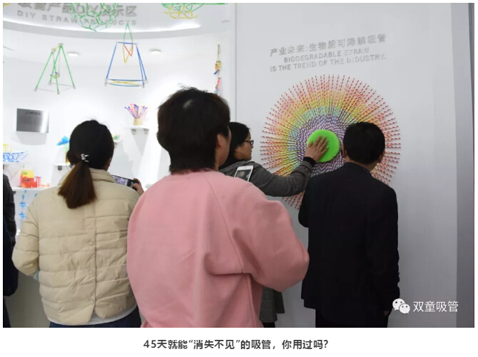 來(lái)到可降解吸管展示區(qū)時(shí),“雙童”李二橋介紹了45天就可以化解成水和二氧化碳的“雙童”生物質(zhì)可降解吸管,大家紛紛表示如此環(huán)保的產(chǎn)品一定是未來(lái)的趨勢(shì)所在!