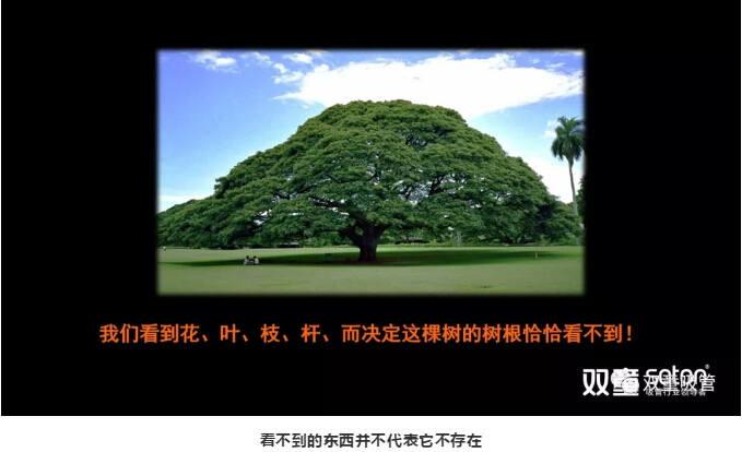 樓仲平通過(guò)“雙童”的圖集案例,引導(dǎo)大家認(rèn)知到,原來(lái)平常司空見(jiàn)慣的思維認(rèn)知并不一定是正確的。隨后,樓仲平通過(guò)一棵樹(shù)的圖片,再次引導(dǎo)大家思考:我們通過(guò)圖片能看到樹(shù)的樹(shù)干、樹(shù)枝、樹(shù)葉等等,但是真正決定這棵樹(shù)的樹(shù)根,卻并不能直接看到。
