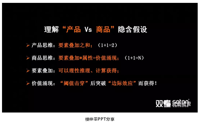 一個(gè)愛馬仕的包憑什么賣到10萬塊錢?這個(gè)案例中,除了產(chǎn)品本身之外,還有之外的文化性、精神性、情感性等屬性疊加。比如,這個(gè)包是你老公送你的,你從中感受到的不僅僅是包的價(jià)值,還有對(duì)方對(duì)你的關(guān)愛,在他心目中你和愛馬仕一樣有著至高無上的地位,這遠(yuǎn)遠(yuǎn)超越了產(chǎn)品本身的價(jià)值,產(chǎn)生了精神屬性。所以,我們要打破產(chǎn)品思維的隱含假設(shè),從而獲得商品的價(jià)值涌現(xiàn)。”