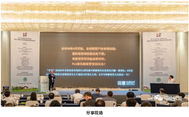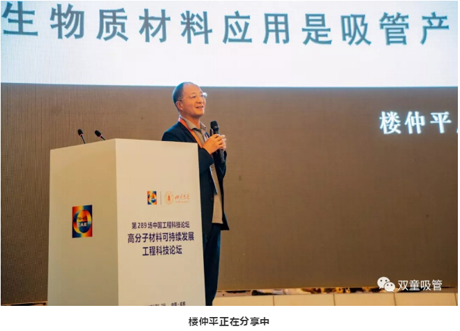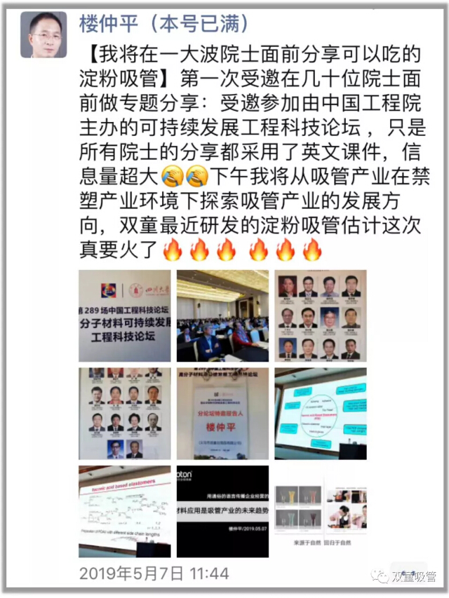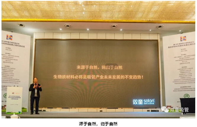 在這樣“談笑有鴻儒,往來(lái)無(wú)白丁”的重要場(chǎng)合,所有院士的分享都采用了英文課件,信息量超大。作為受邀分享嘉賓之一,“雙童”樓仲平也從吸管產(chǎn)業(yè)角度出發(fā)分析在禁塑大趨勢(shì)下吸管行業(yè)的發(fā)展方向,為大家?guī)?lái)了《生物降解材料應(yīng)用是吸管產(chǎn)業(yè)的未來(lái)發(fā)展趨勢(shì)》主題分享!