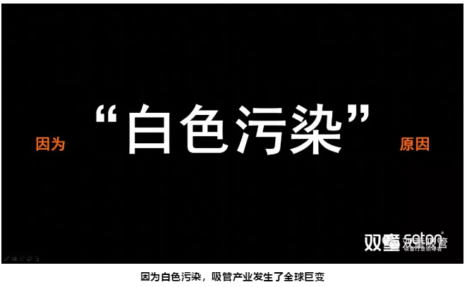 首先,樓仲平用一組精美的產(chǎn)品圖片向大家展示了“雙童”各式各樣的創(chuàng)新吸管,打破了大家認(rèn)為吸管是“低、小、散、弱”小商品的傳統(tǒng)認(rèn)知。而當(dāng)大家都還沉浸在吸管還可以有這么多花樣的認(rèn)知時(shí),樓仲平卻話(huà)鋒一轉(zhuǎn),向大家說(shuō)明:“看起來(lái)很美的吸管產(chǎn)業(yè)突然有一天發(fā)生了全球巨變!”