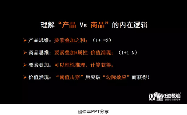 接著,樓仲平引導大家思考“產(chǎn)品 VS 商品”的關系,在這個模型中,產(chǎn)品本身(一根吸管)只是組成“商品”的基礎核心,是最基本的要素疊加之和,1+1=2。