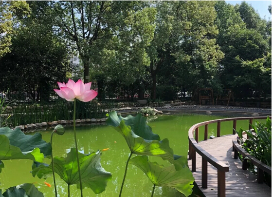 “接天連葉無窮碧,映日荷花別樣紅”。走到景觀湖邊的小木橋上,怡人的景色就映入了眼簾。
