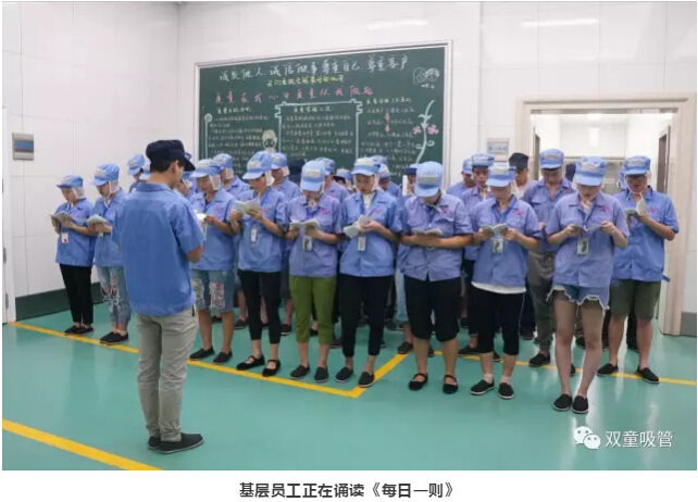 首先,就是晨讀環(huán)節(jié)。“雙童”所有員工在上班之前都會在統(tǒng)一時間誦讀“雙童”的企業(yè)文化叢書——《每日一則》。