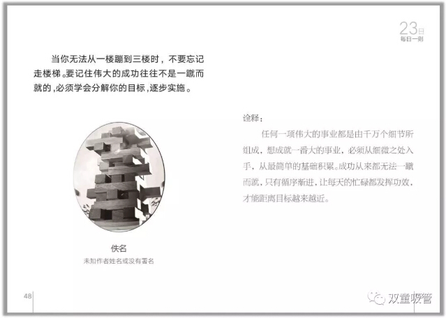 這本《每日一則》里,共收錄了31句名人經(jīng)典語錄,以月度為單位讓員工進行重復(fù)誦讀,內(nèi)容包含了專注、創(chuàng)新、共贏、正氣等主題。這可是員工們從幾千條好句里挑出來,并且自己解析的呢!