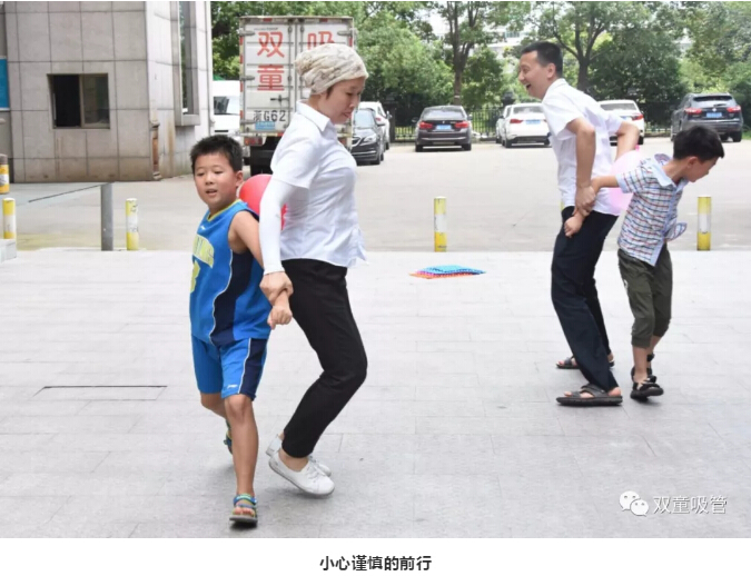 游戲的第一項(xiàng)就是“綁腳前行”!瞧!爸爸媽媽和寶貝們的腳都綁在了一起,這真是最“親密”的瞬間!