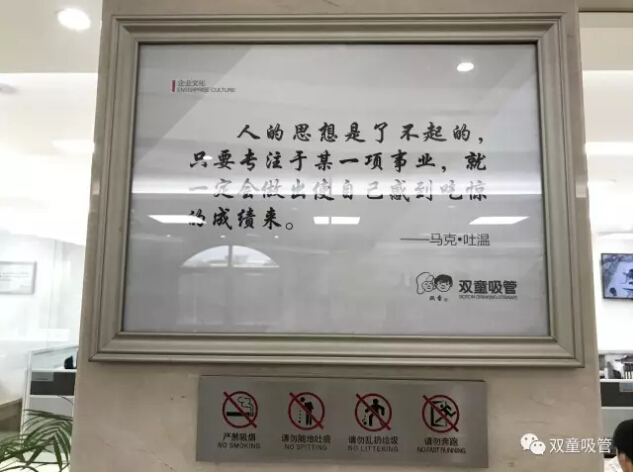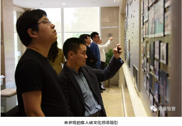 原來,在“雙童”行政樓的墻上,到處都掛著一幅幅精致的鏡框,而鏡框里的內(nèi)容,就是能夠體現(xiàn)“雙童”核心文化價(jià)值觀的文化標(biāo)語(yǔ)!