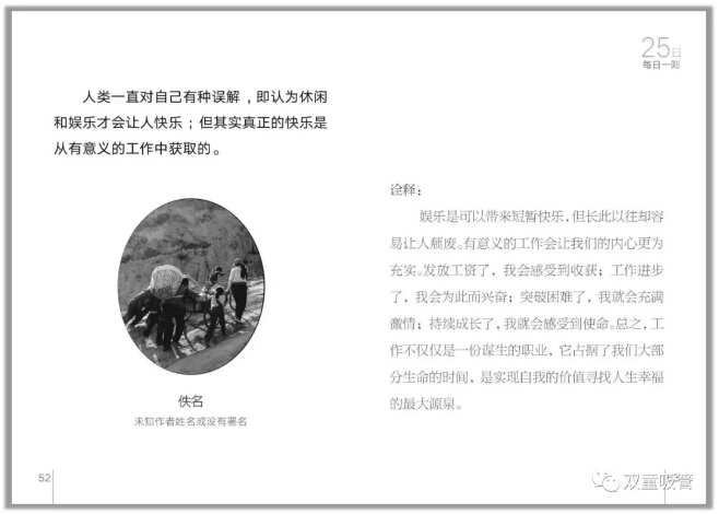 人類一直對(duì)自己有種誤解, 即認(rèn)為休閑和娛樂才會(huì)讓人快樂;但其實(shí)真正的快樂是從有意義的工作中獲取的。——佚名