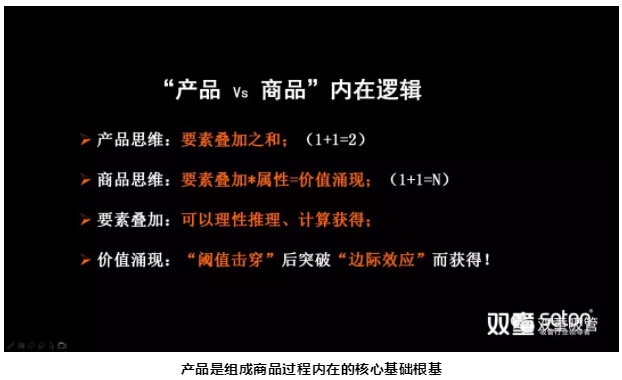 產(chǎn)品本身只是要素疊加之和,如:1+1=2。但商品是在產(chǎn)品之外不斷疊加常人難以看見的內(nèi)在屬性,我們可以通過“要素拆解”看到這些屬性,如產(chǎn)品的質(zhì)量、標準、創(chuàng)意性,文化性等,從而讓產(chǎn)品內(nèi)在的屬性不斷外延,改變產(chǎn)品的要素成本疊加從1+1=2,逐漸轉(zhuǎn)變?yōu)?+1=N,繼而實現(xiàn)產(chǎn)品內(nèi)在價值的全面提升。
