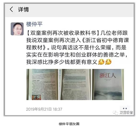 號外!號外!“雙童”案例再次被收錄教科書!近日,幾位老師告訴當家人樓仲平,“雙童”案例出現(xiàn)在浙江省初中德育課程教材《浙江人》當中,樓仲平也第一時間在朋友圈中分享了這個好消息,并感言:這比掙多少錢都有意義!