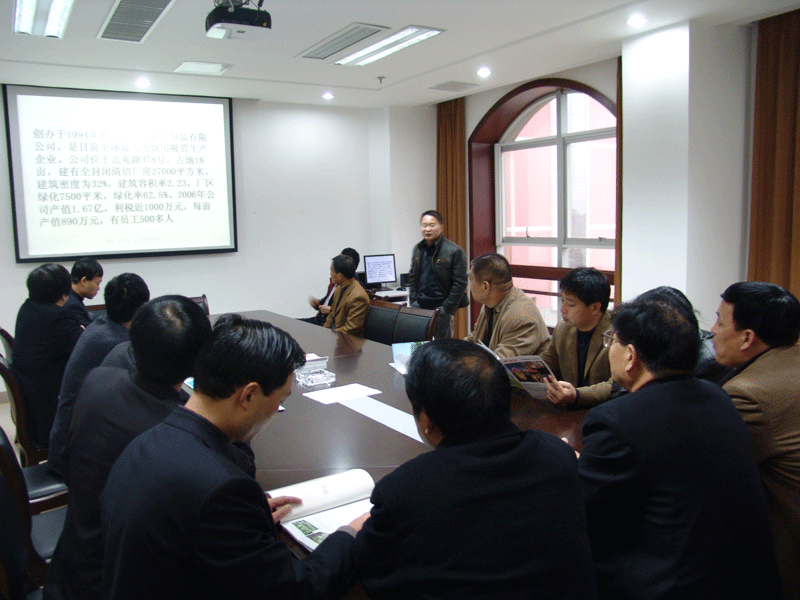 2007年12月25日上午,義烏市宣傳部協(xié)同陜西戶縣政府考察團來我公司考察,公司總經(jīng)理助理盧程航進行了熱情接待,并向考察團詳細介紹了公司發(fā)展歷程、產(chǎn)品質(zhì)量、起草國家標準、循環(huán)經(jīng)濟建設(shè)、企業(yè)文化和諧理念等方面。