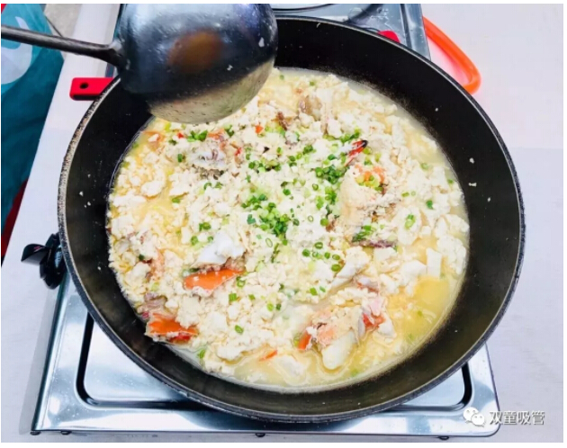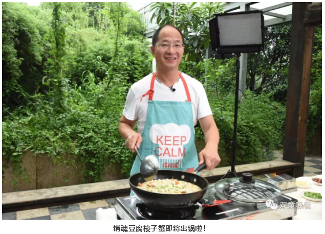 先用剪刀將梭子蟹剪成塊,待鍋中油燒熱后,放入配料和蟹一起翻炒。