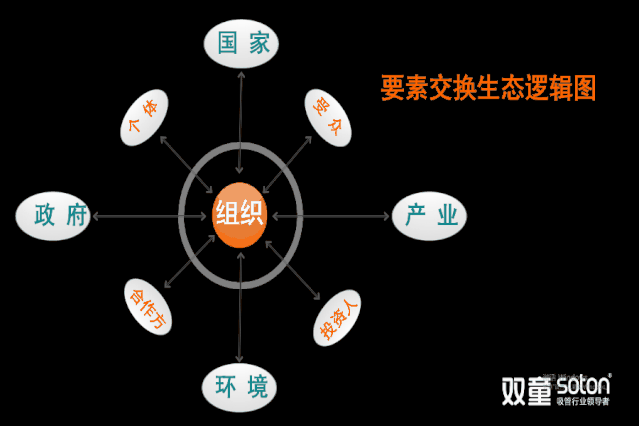 講到這里,樓仲平為了讓現(xiàn)場(chǎng)觀眾更好地理解,便展示了一副要素交換生態(tài)邏輯圖,清晰地向大家說明:組織在發(fā)展過程中,與環(huán)境、產(chǎn)業(yè)、政府、國(guó)家等宏觀社會(huì)產(chǎn)生了鏈接,這種鏈接實(shí)際上是各種要素的相互交換和賦予。在合情、合理、合法、合乎道義的交換過程中,本質(zhì)上雙方出于“利己”的目的,但同時(shí)又給對(duì)方創(chuàng)造了價(jià)值,讓雙方都有所獲得,從而最終實(shí)現(xiàn)了“利他”。