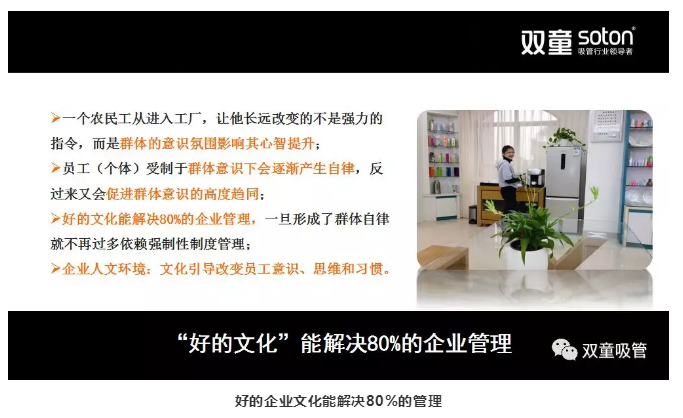 我再舉兩個例子來幫助大家理解。第一,許多到訪“雙童”的客人會發(fā)現(xiàn):“雙童”的環(huán)境極致干凈,甚至于餐廳都不需要阿姨打掃,為什么呢?因為我們通過引導(dǎo)員工學(xué)習(xí),讓他們形成了群體意識。員工通過長時間自律提升后,就不再需要他人監(jiān)督,就會形成了良好的行為習(xí)慣,并自覺遵守企業(yè)的準(zhǔn)則規(guī)范!所以,衛(wèi)生不是阿姨打掃出來的,是員工自律的結(jié)果!