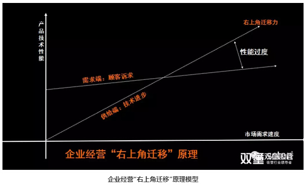 當(dāng)企業(yè)經(jīng)營(yíng)的“右上角遷移”力高于需求端客戶訴求的“右上角遷移”力時(shí),將會(huì)產(chǎn)生“性能過(guò)度”。由此看出,這個(gè)過(guò)程當(dāng)中企業(yè)所投入的大量成本,大量技術(shù)研發(fā),大量創(chuàng)新實(shí)際上是造成了巨大浪費(fèi)。