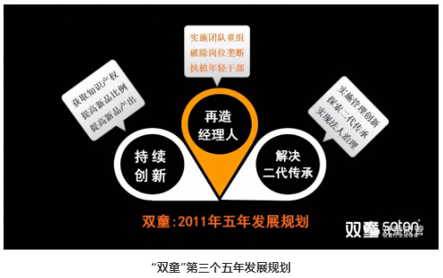 2011年,“雙童”發(fā)布第三個(gè)《企業(yè)五年發(fā)展規(guī)劃》,明確“再造經(jīng)理人”計(jì)劃,明確領(lǐng)導(dǎo)層更替:選拔培養(yǎng)年輕領(lǐng)導(dǎo)層、重要崗位領(lǐng)導(dǎo)年輕化、明確實(shí)施股份制改革,慢慢解決管理層老化問題!