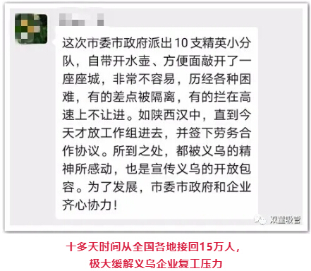 在抗擊疫情期間,義烏政府的“復(fù)工硬核”措施也頻登微博熱搜,包大巴、包列車(chē)、包飛機(jī)……費(fèi)用全部由政府買(mǎi)單,義烏還準(zhǔn)備了4萬(wàn)個(gè)酒店床位供需要隔離的員工居住。