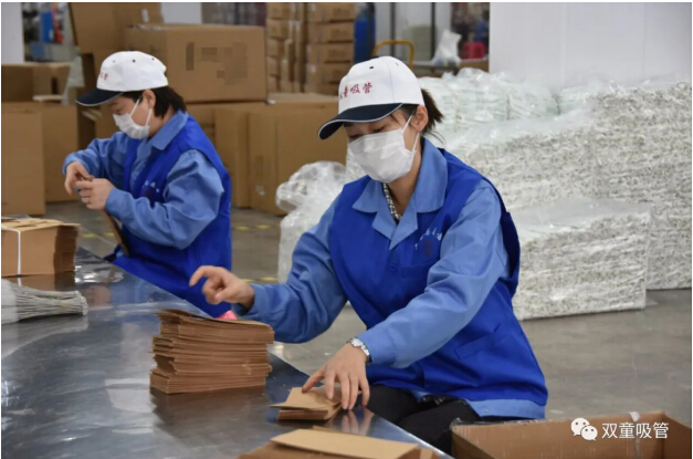 從2月25日開始,上崗的工會(huì)機(jī)關(guān)干部、婦聯(lián)志愿者相繼來到“雙童”,經(jīng)過測(cè)量體溫、消毒登記、查看健康碼、更衣?lián)Q帽等一系列防疫流程后,進(jìn)入了包裝車間。