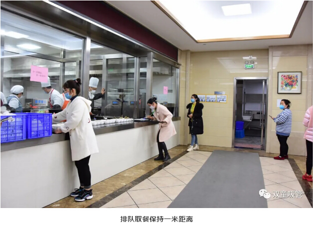 為了讓“共享員工”安心在企業(yè)工作,“雙童”也免費提供“兩葷一素”標準的中餐與晚餐。疫情下,為了安全起見,“雙童”特地規(guī)劃出共享員工的專屬餐桌,座位之間用保鮮膜隔板隔開,同時也引導大家排隊取餐保持一米距離,餐桌四角就坐,讓大家放心就餐。