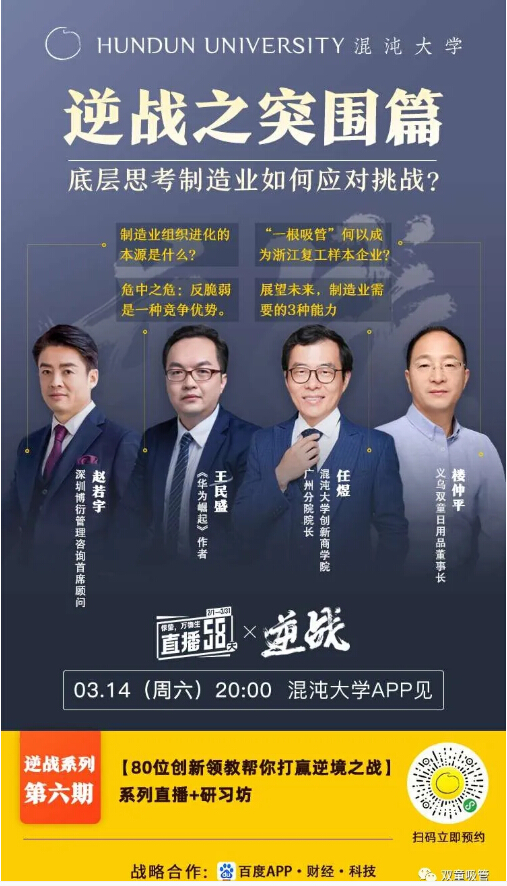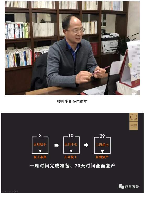 近日,“雙童”樓仲平受邀在混沌大學(xué)APP和混沌領(lǐng)教任煜、王民盛、趙若宇等老師,圍繞逆戰(zhàn)之突圍篇——制造業(yè)如何應(yīng)對挑戰(zhàn)主題進行分享互動。樓仲平也借此機會線上分享了“雙童”的復(fù)工反思錄,引起數(shù)萬人觀看。