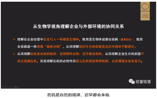 從生物學(xué)視角理解,樓仲平認為:企業(yè)經(jīng)營中企業(yè)與人一樣都是生物體,既然是生物體就都會染?。ㄔ庥鑫C),既然會染病就一樣遵循“森林法則”,從而理解組織生存的前提是適應(yīng)環(huán)境而不斷進化。