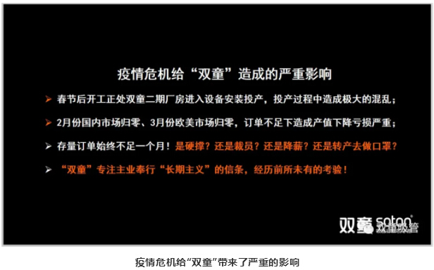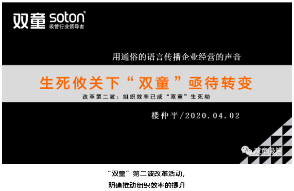 因此,在危機(jī)來臨之時(shí),“雙童”并沒有恐慌,而是選擇抓住機(jī)會(huì),迎接挑戰(zhàn)。但是在很多身邊的同行都開始轉(zhuǎn)行做口罩,做防疫物資的時(shí)候,奉行長期主義的“雙童”認(rèn)為,轉(zhuǎn)行踩風(fēng)口做口罩我們并不擅長。所以,4月2日,“雙童”開始推動(dòng)企業(yè)第二波改革活動(dòng),明確推動(dòng)組織效率的提升。