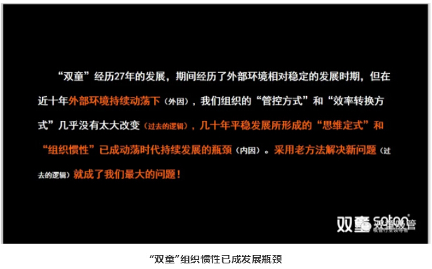 此外,我們還認(rèn)識(shí)到,疫情危機(jī)后,外部環(huán)境的動(dòng)蕩性將持續(xù)加劇,過去的邏輯對(duì)未來逐漸失效,“雙童”幾十年平穩(wěn)發(fā)展所形成的“組織慣性”已經(jīng)成為了持續(xù)發(fā)展的瓶頸,因此,“雙童”積極推動(dòng)組織做出改變。