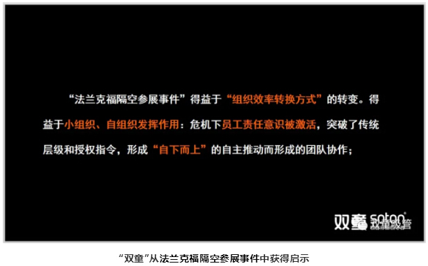 在這個(gè)過程中,組織效率發(fā)生了轉(zhuǎn)變,從以往的“要你做”,變成了現(xiàn)在的“我要做”,突破了指令的授權(quán),實(shí)現(xiàn)了團(tuán)隊(duì)的協(xié)作??梢哉f如果“雙童”沒有進(jìn)行組織轉(zhuǎn)變,這樣的事情就不太可能發(fā)生。