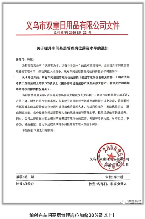 不僅如此,”雙童”在第二波改革推進(jìn)過程當(dāng)中,明確給所有車間基層管理崗位加薪30%及以上,目的是為了吸引外部優(yōu)秀的生產(chǎn)管理人才進(jìn)入,形成倒逼機(jī)制,推動崗位競爭,解決組織效率低下、團(tuán)隊(duì)老化的問題,實(shí)現(xiàn)優(yōu)勝劣汰,從而讓用心做事的人得益,讓追求結(jié)果的奮斗者得到彰顯!