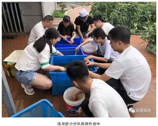 雖然時(shí)間緊任務(wù)重,但大家安排起了流水線作業(yè),先刷,再洗,清理蝦頭,效率也是杠杠滴!